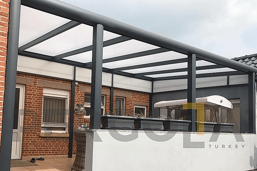 A Veranda Fixed Roof System is a roofed outdoor structure attached to a building, providing a sheltered open-air space. It protects the area from weather elements while maintaining a bright and airy feel.